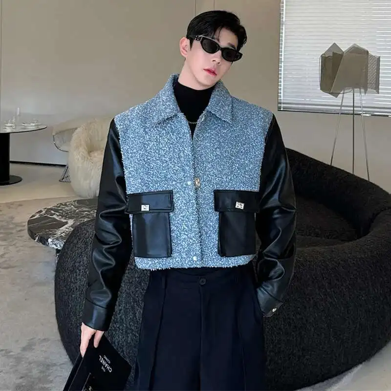 LUZHEN Spring Fabric Short Fashion Jackets Patchwork Faux Leather Color Contrast Trendy Casual Outerwear Male Clothes LZ6326
