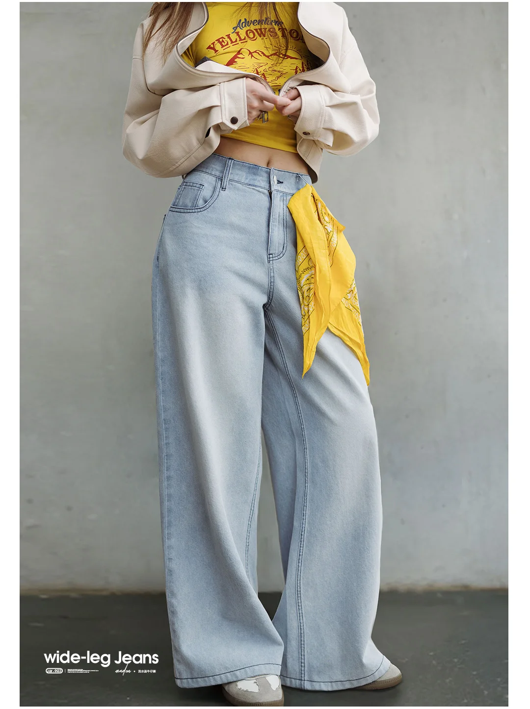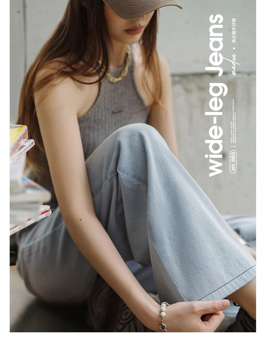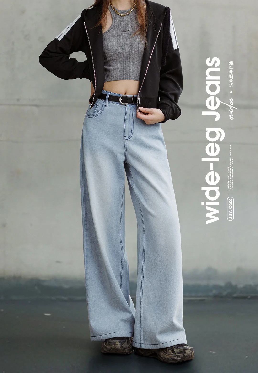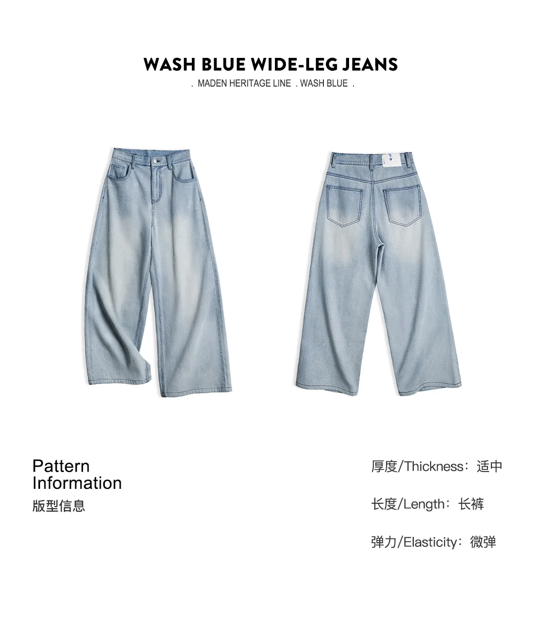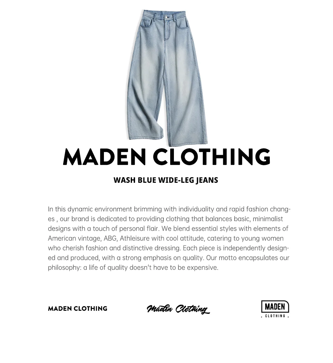 Maden Vintage Washed Blue Wide Leg Jeans for Women Loose Do Old Straight Leg Pants 10 OZ Cotton Breathable Lightweight Trousers