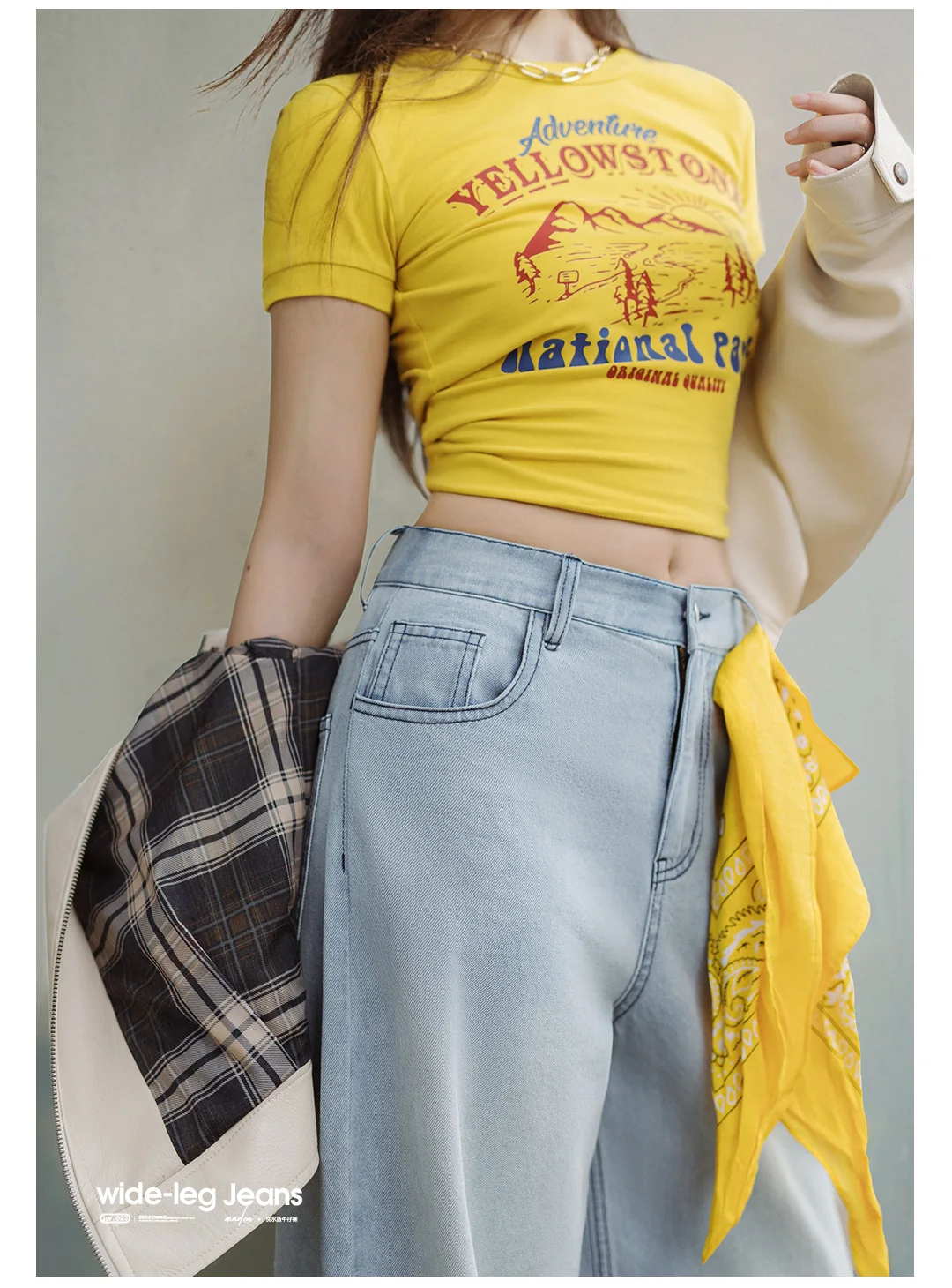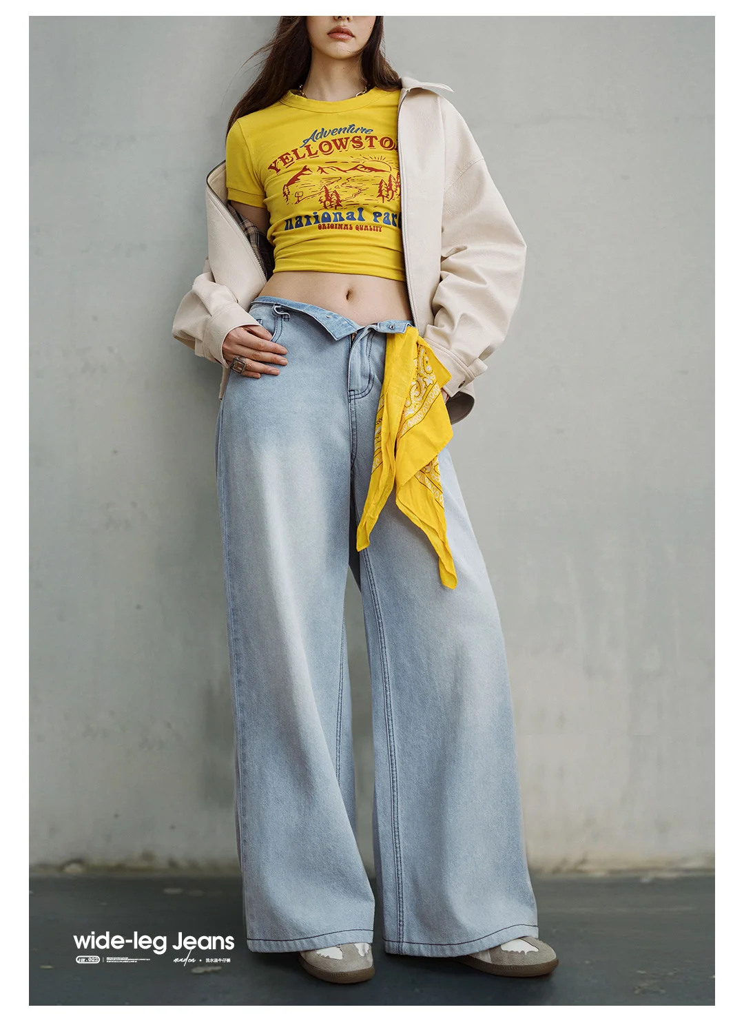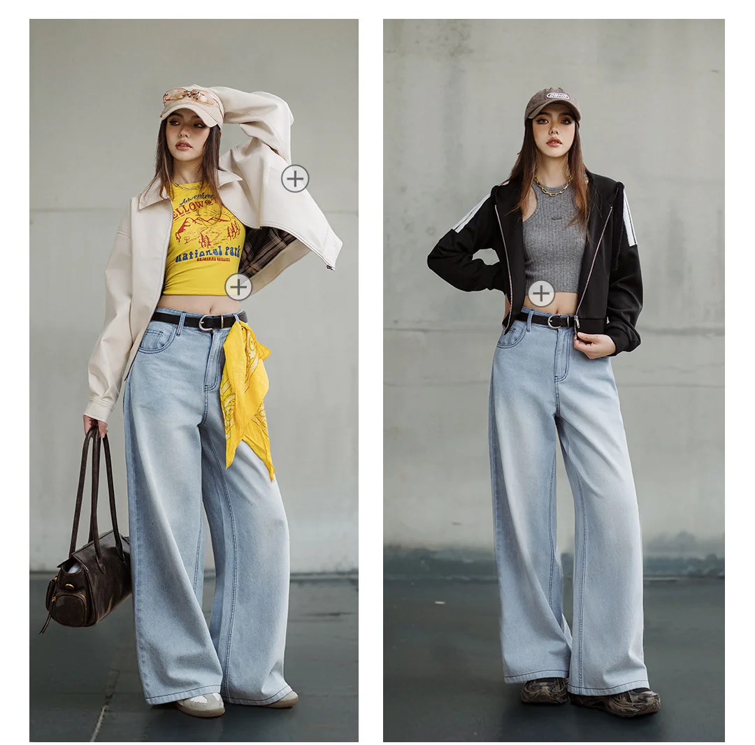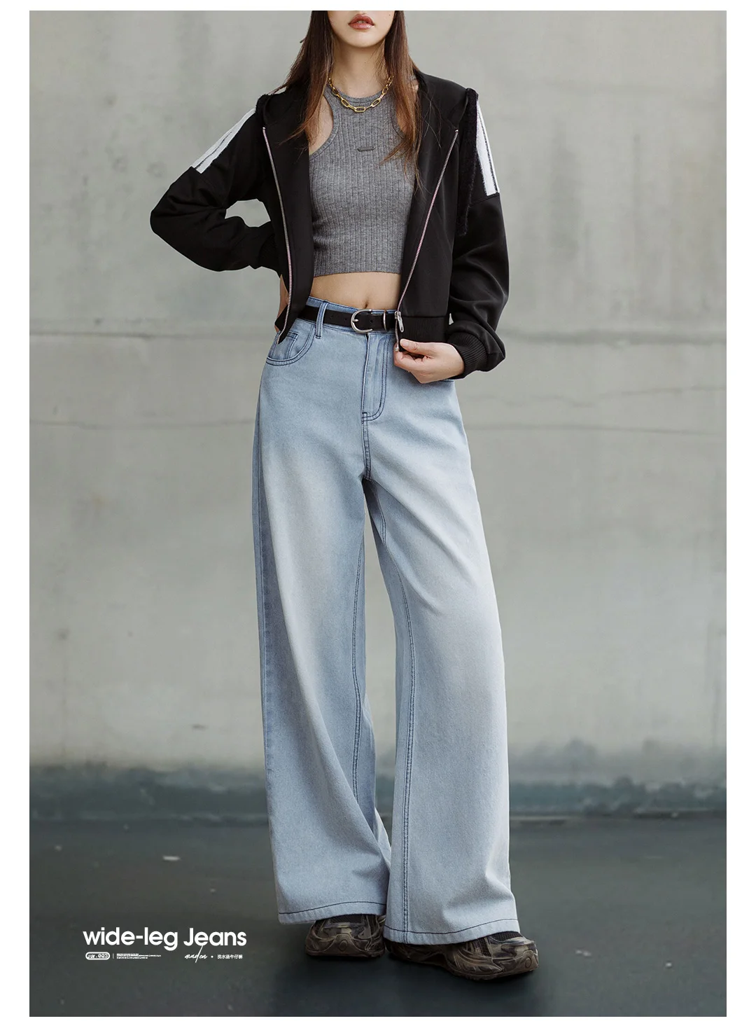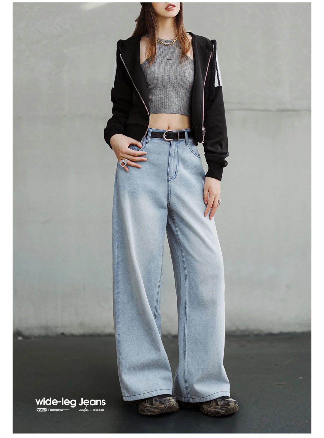 Maden Vintage Washed Blue Wide Leg Jeans for Women Loose Do Old Straight Leg Pants 10 OZ Cotton Breathable Lightweight Trousers