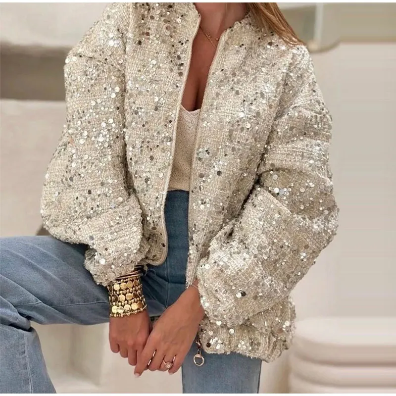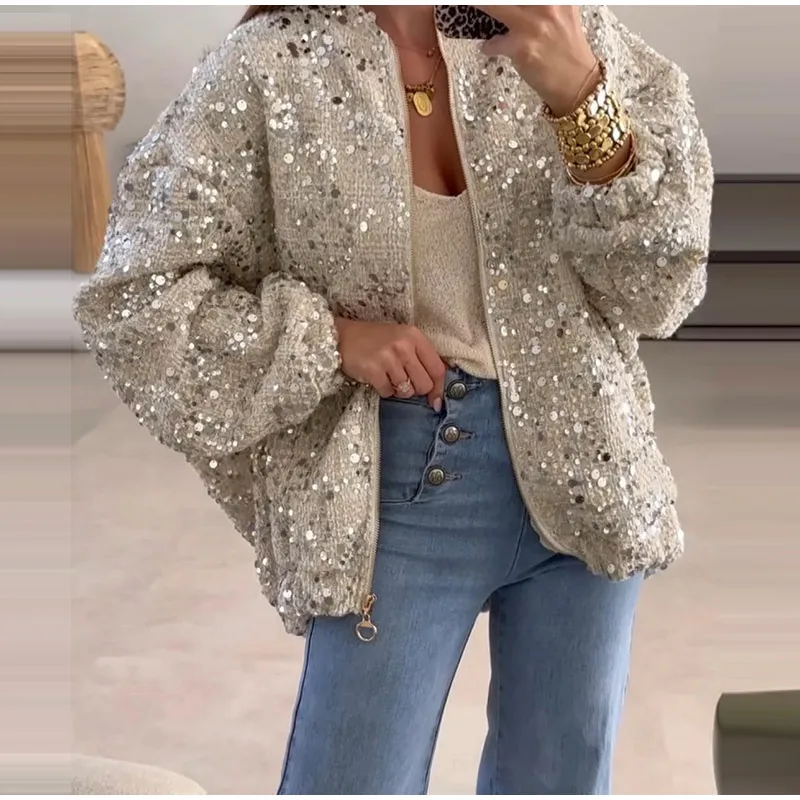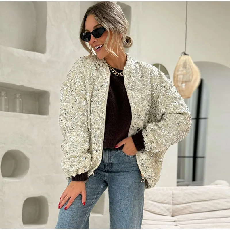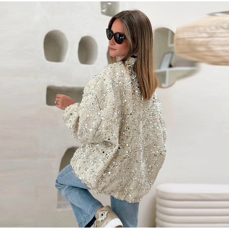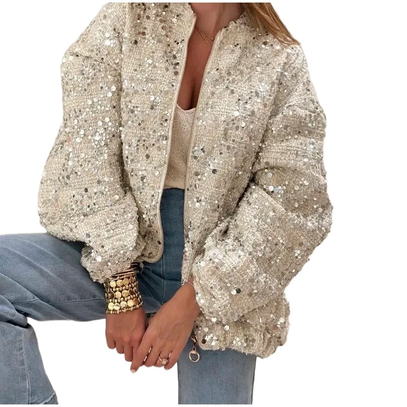 Sparkly Women's Loose Fit Sequin Jacket Coat Stand Collar Zip-Up Silver Cropped Outerwears Chic Autumn Casual Daily Streetwear