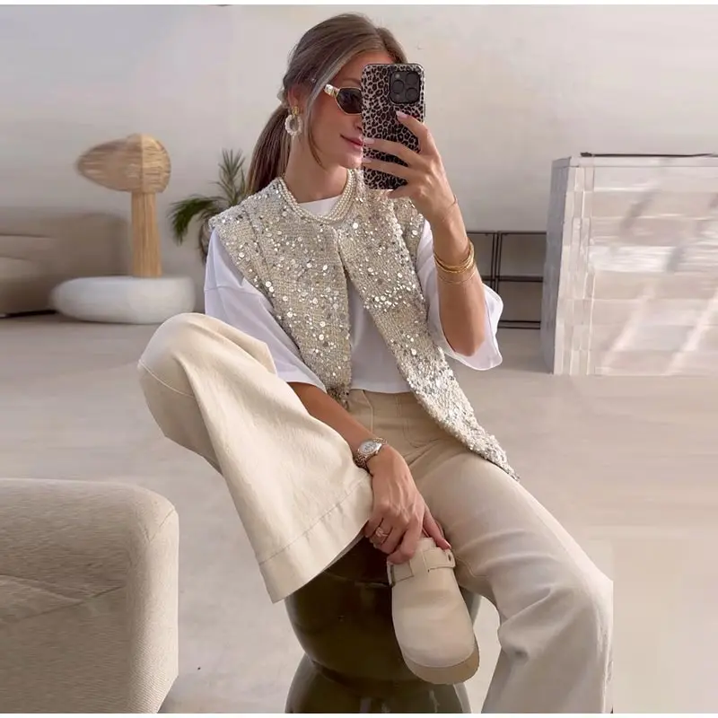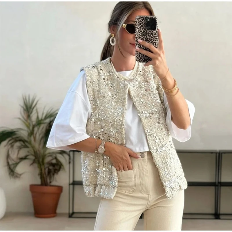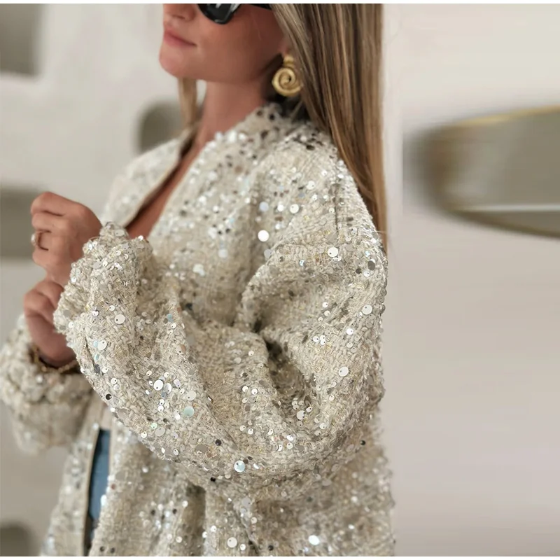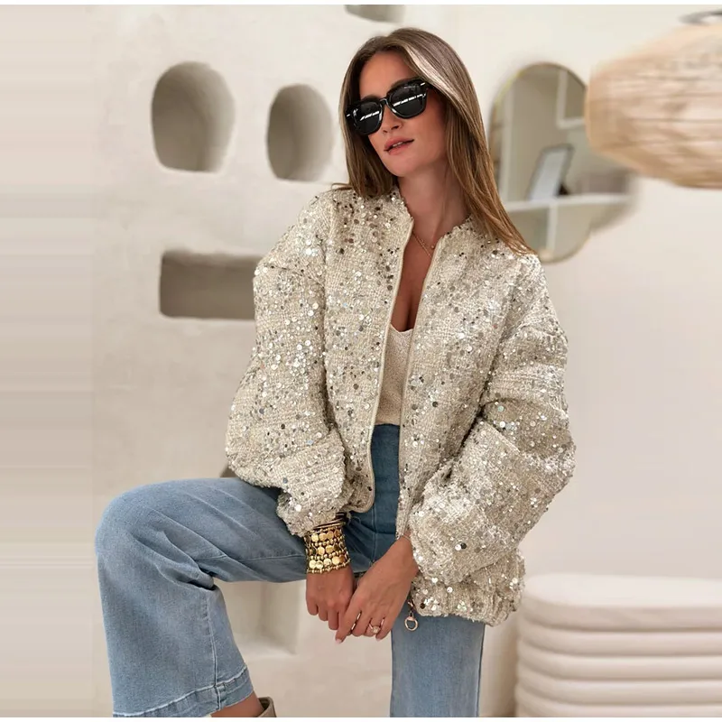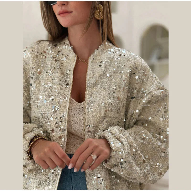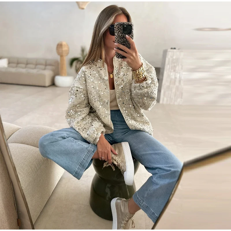 Sparkly Women's Loose Fit Sequin Jacket Coat Stand Collar Zip-Up Silver Cropped Outerwears Chic Autumn Casual Daily Streetwear