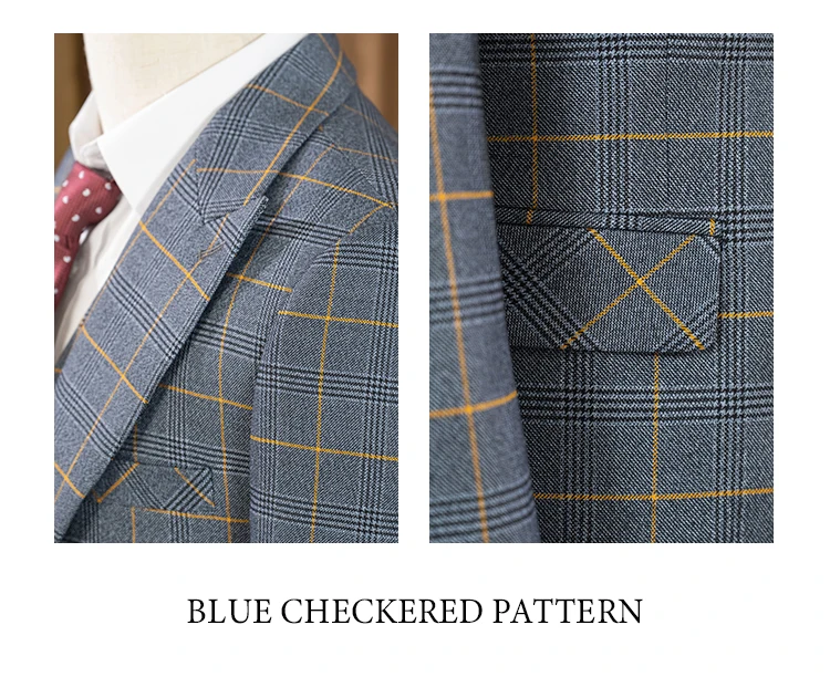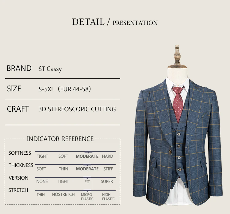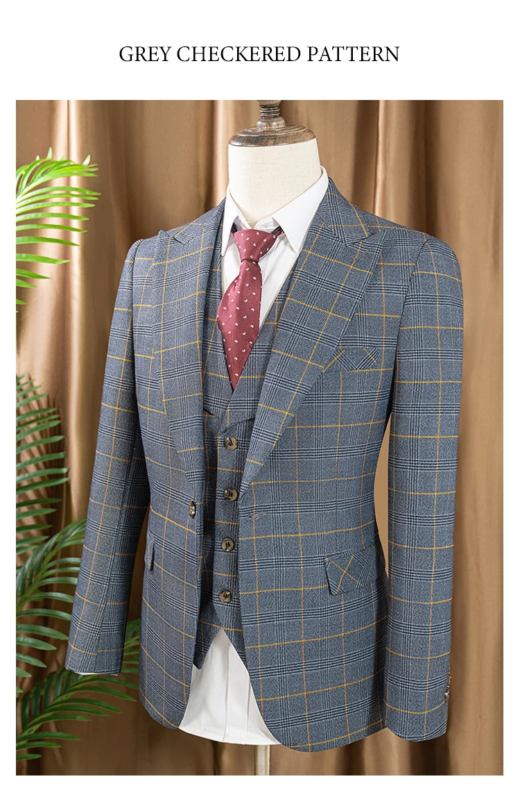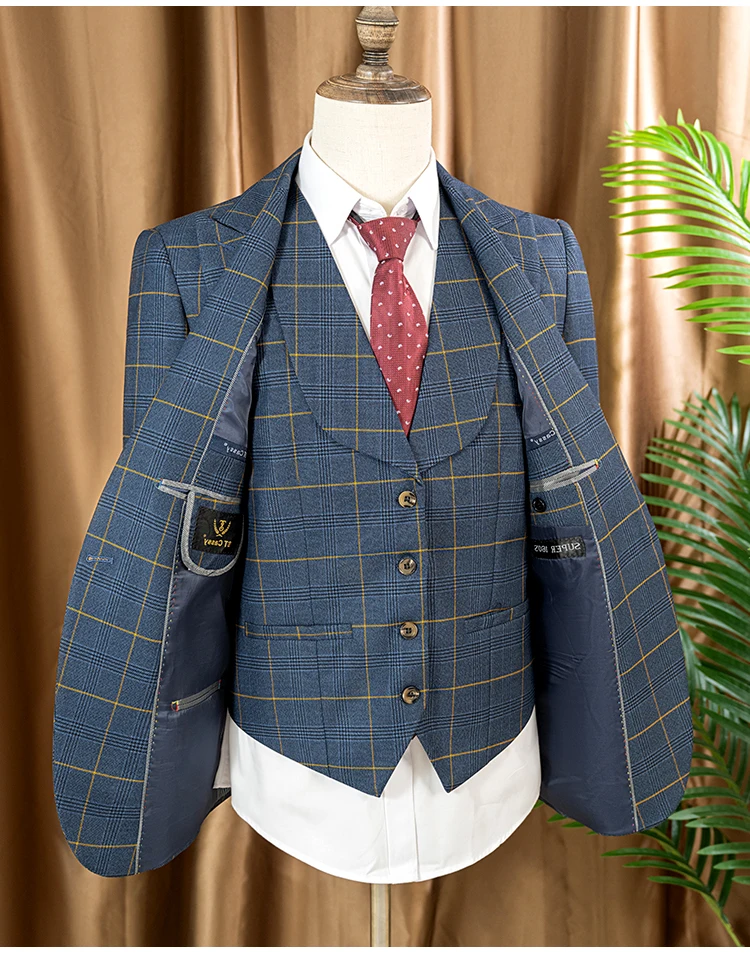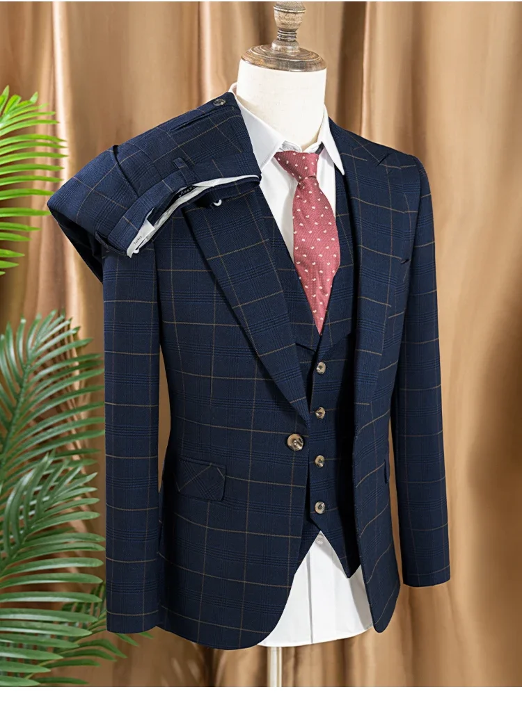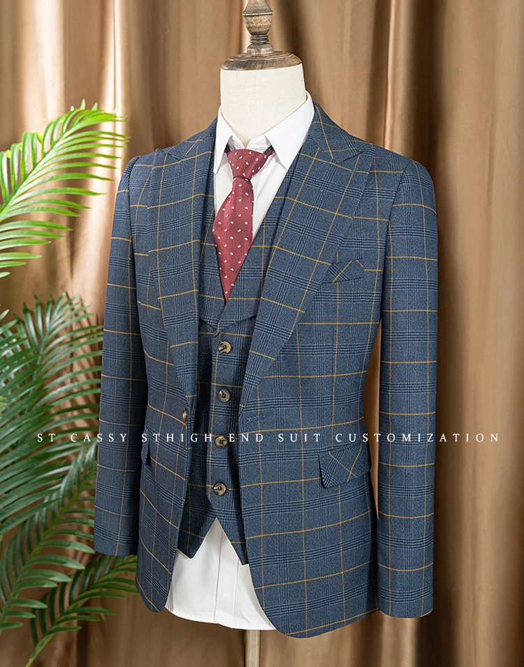 ST Cassy high quality 3 Piece Checkered Suit Set dark blue Stylish Business Office Wedding Formal Outfit Elegant full man suit